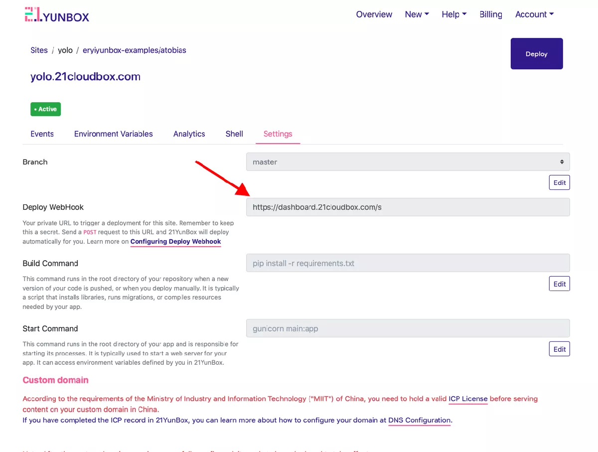 Step 1: Get Your 21YunBox Deploy Webhook URL