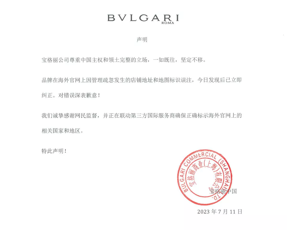 On July 11th, Bvlgari quickly released a statement addressing the issue. The company expressed its unwavering respect for China’s sovereignty and territorial integrity. It acknowledged that the mislabeling of store addresses on the overseas website was due to management oversight. However, as soon as the error was discovered, immediate corrections were made. Bvlgari deeply apologized for the mistake and expressed gratitude for the vigilance of netizens. The company also assured the public that it is working with a third-party international service provider to ensure the accurate labeling of countries and regions on its overseas website.