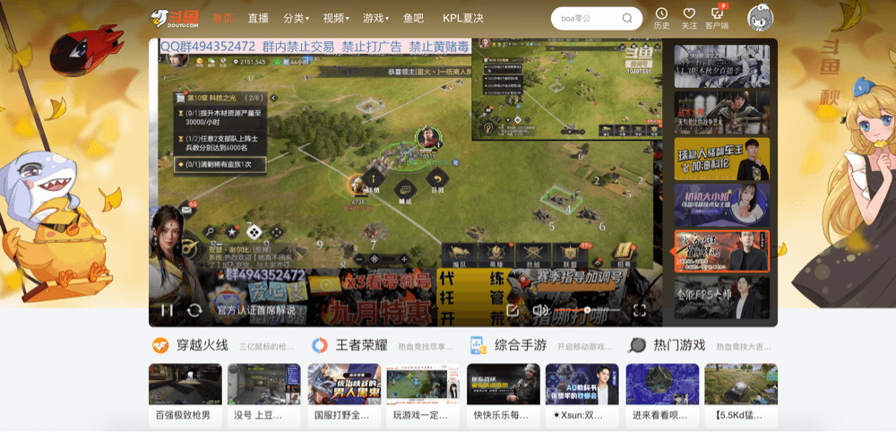 Douyu, also known as 斗鱼, is one of the largest Chinese videos live streaming service platforms, focusing on esports and online gaming.