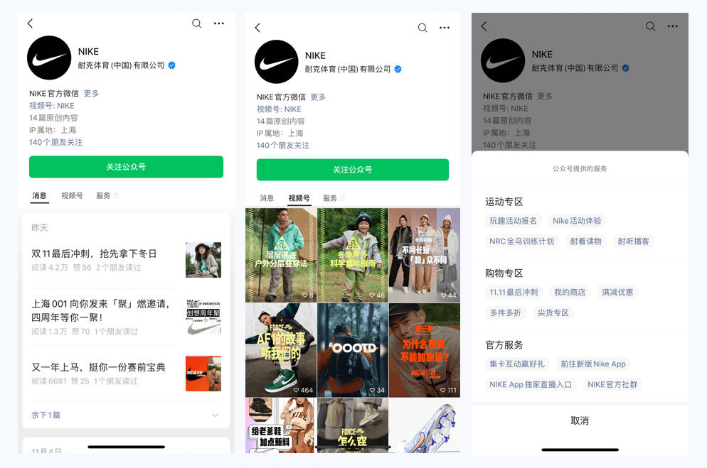 Official accounts support both Chinese and non-China registered businesses. For example, Nike China has an official account on WeChat to promote products, share brand updates, direct users to its online store and local branches, etc.