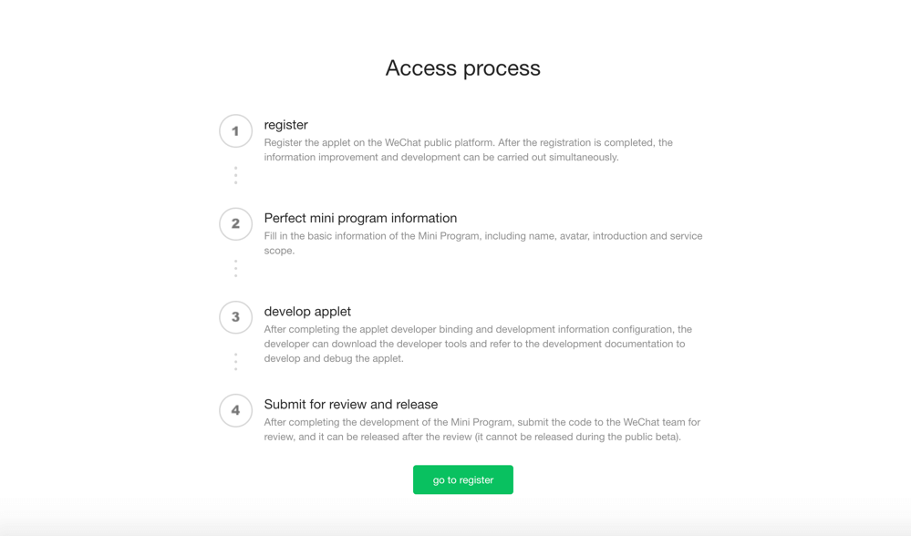 Step 1 To get started, sign up for a WeChat Official Account on WeChat Public Platform with an email address, a business license or entity, your company bank account, and a copy of the ID card of the contact person.