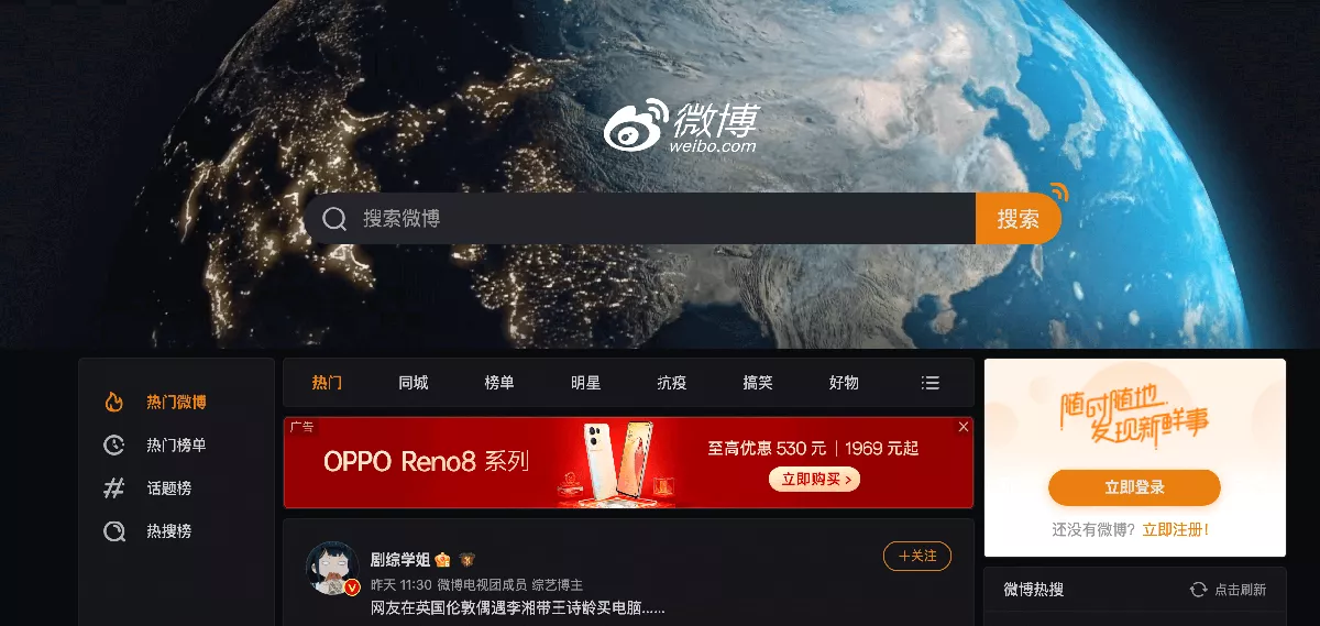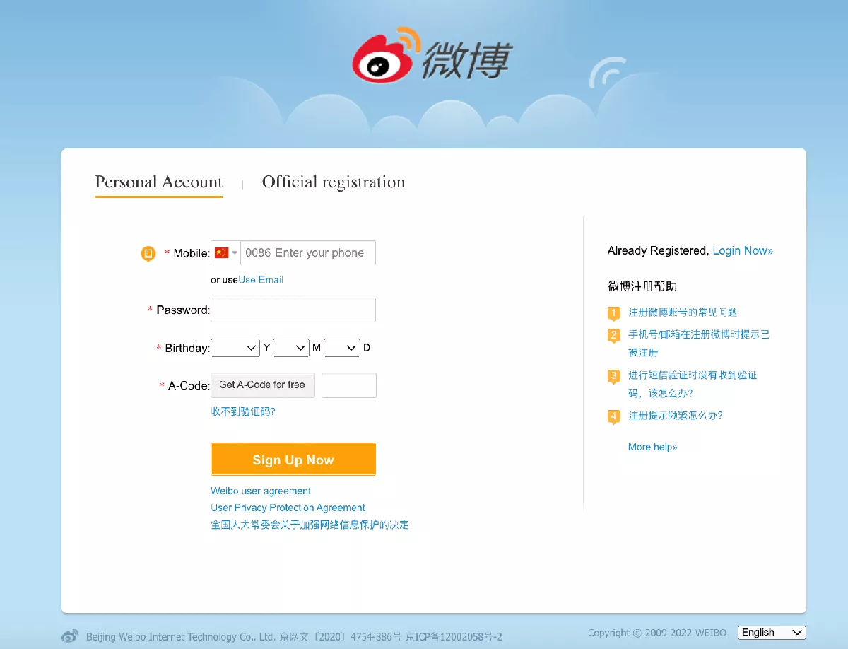 The Weibo app is straightforward to use in English and compatible with iOS and Android devices, it also has an international version. Download the Weibo app, or sign up here and select ‘English’ in the bottom right corner of the language menu to sign up to Weibo in English.
