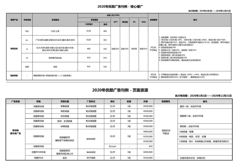 Costs for advertising on Youku range from 0.3 yuan to 140 yuan Cost Per Thousand (CPM). Refer to Youku’s full pricing here (updated 2020).
