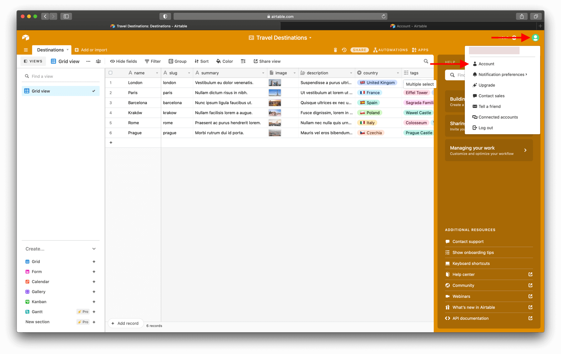 | AIRTABLE_TABLE_NAME | Destinations for this starter. If you use a custom base, you can find the name of the base on the tab (top left) |