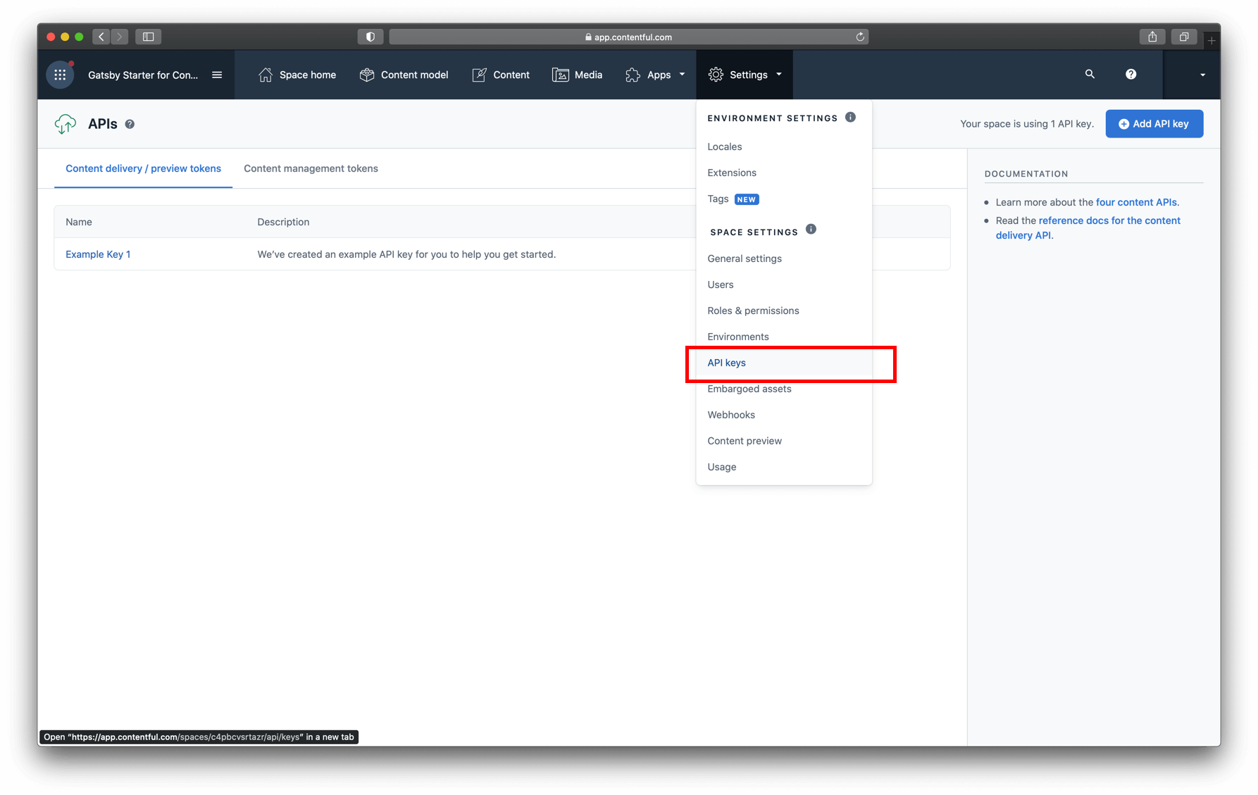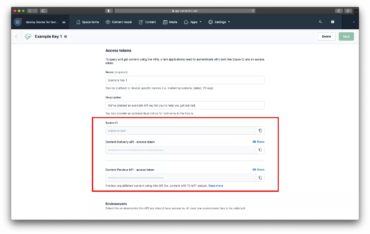 Here are the screenshots of finding the space ID and the access token for contentful.