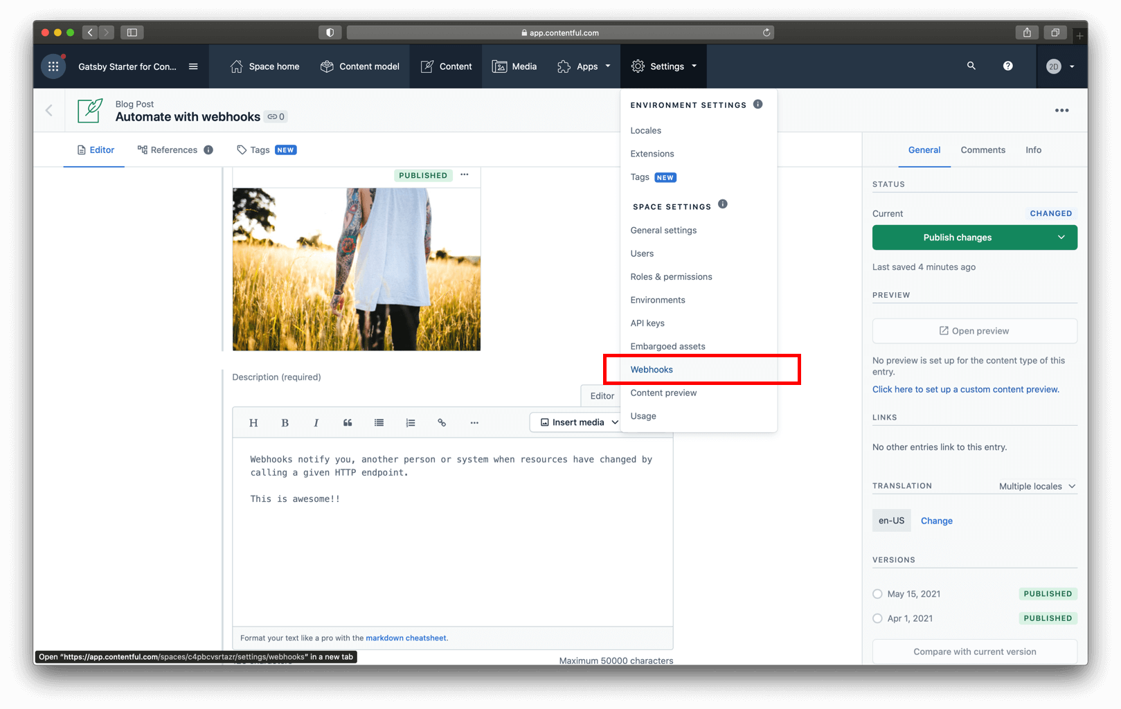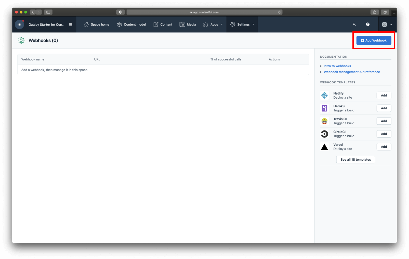 1. On Contentful Dashboard, click “Settings” -> “Webhooks.”