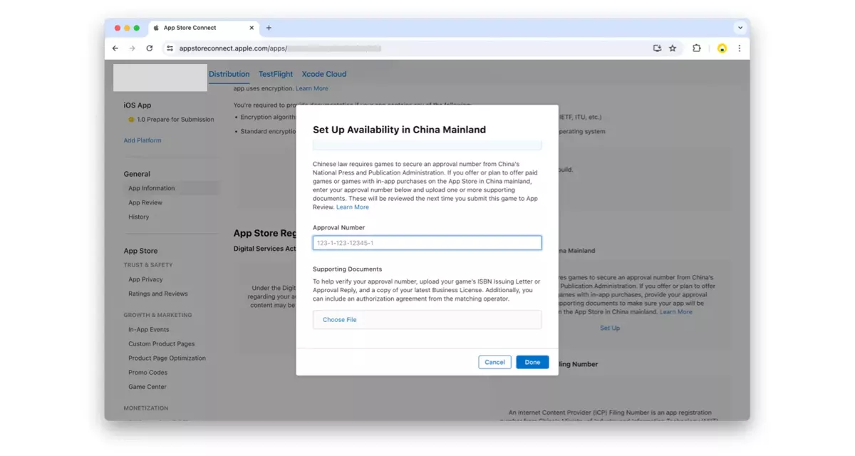“Chinese law requires games to secure an approval number from China’s National Press and Publication Administration. If you offer or plan to offer paid games or games with in-app purchases on the App Store in China mainland, enter your approval number below and upload one or more supporting documents. These will be reviewed the next time you submit this game to App Review.”