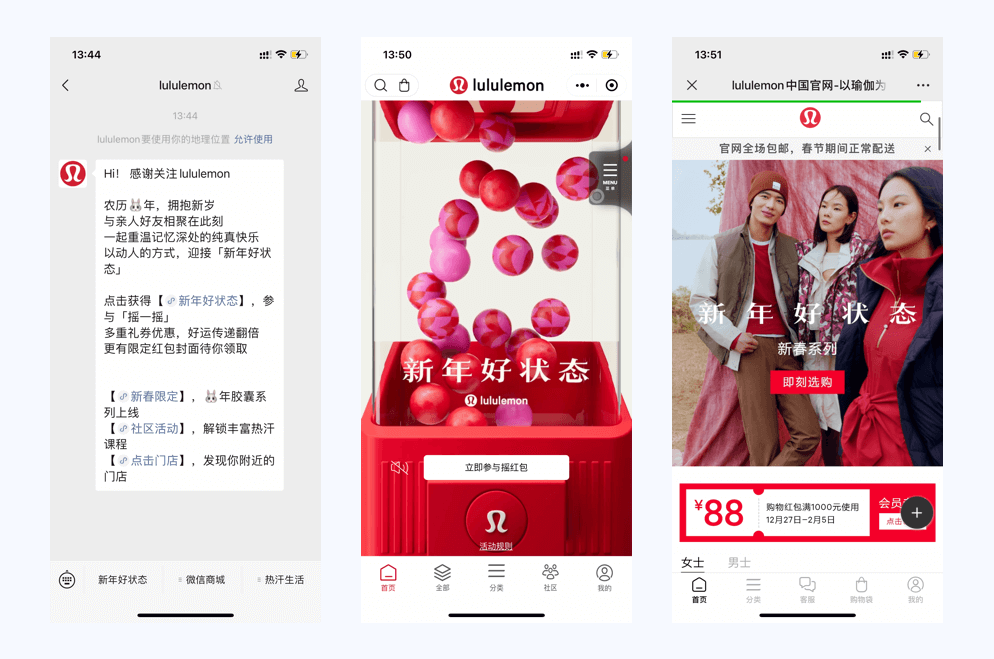 They take advantage of menu functions, which allow followers to directly go to the Lululemon WeChat online store for purchases and find nearby offline stores. They also design online campaigns for special occasions such as Chinese New Year. After receiving content push notifications, users can read the article and tap to receive red packets of coupons, leading them to LuluLululemon’shat online store directly. The whole experience is smooth and effective for purchase conversion.