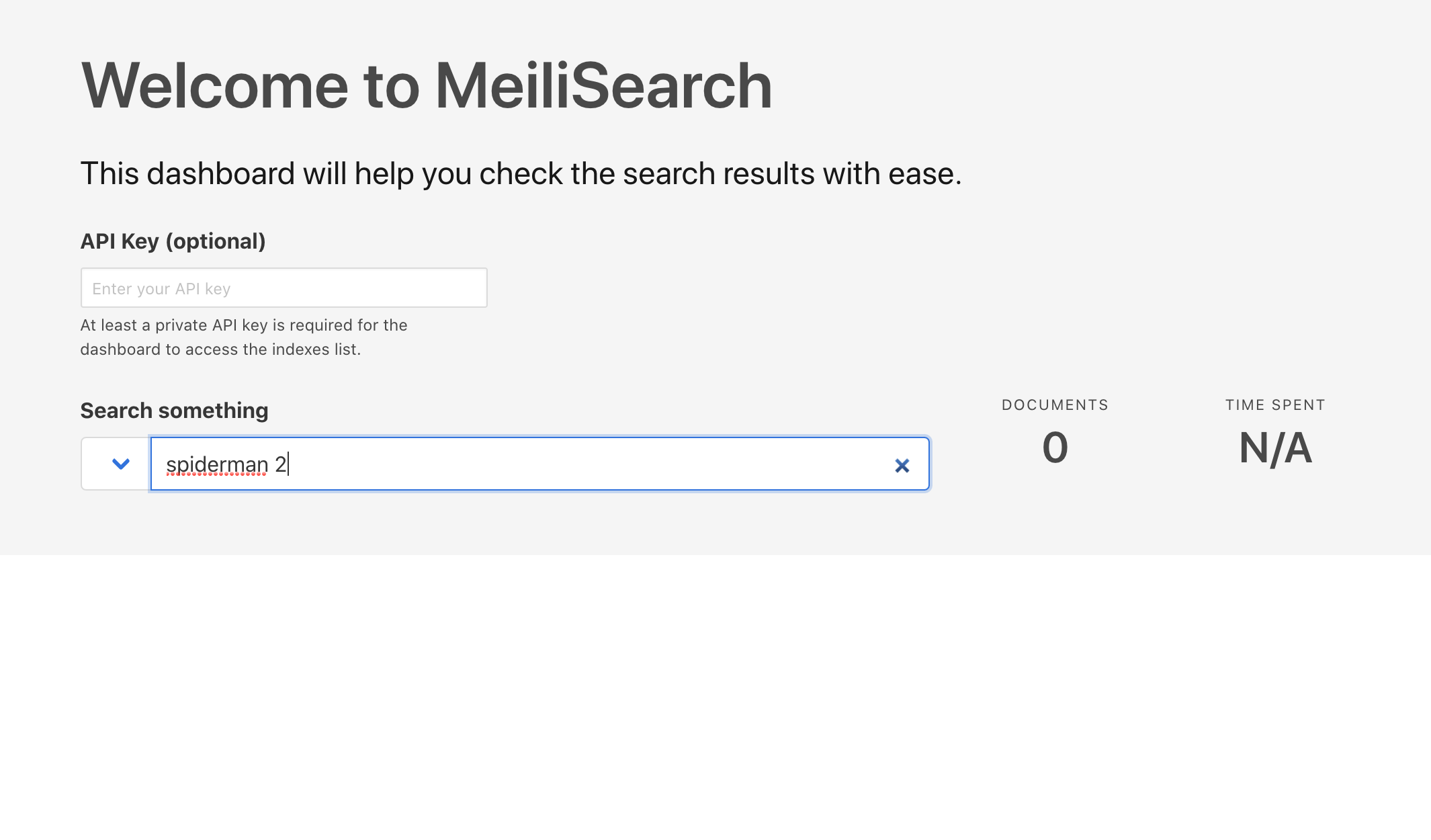 You can test it in the MeiliSearch dashboard, and you will see that there are no results for the search now. This is because we have not added a search index.