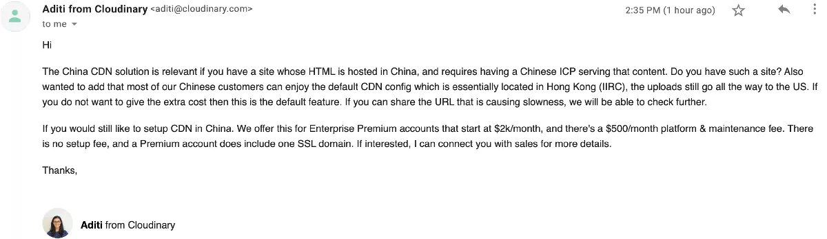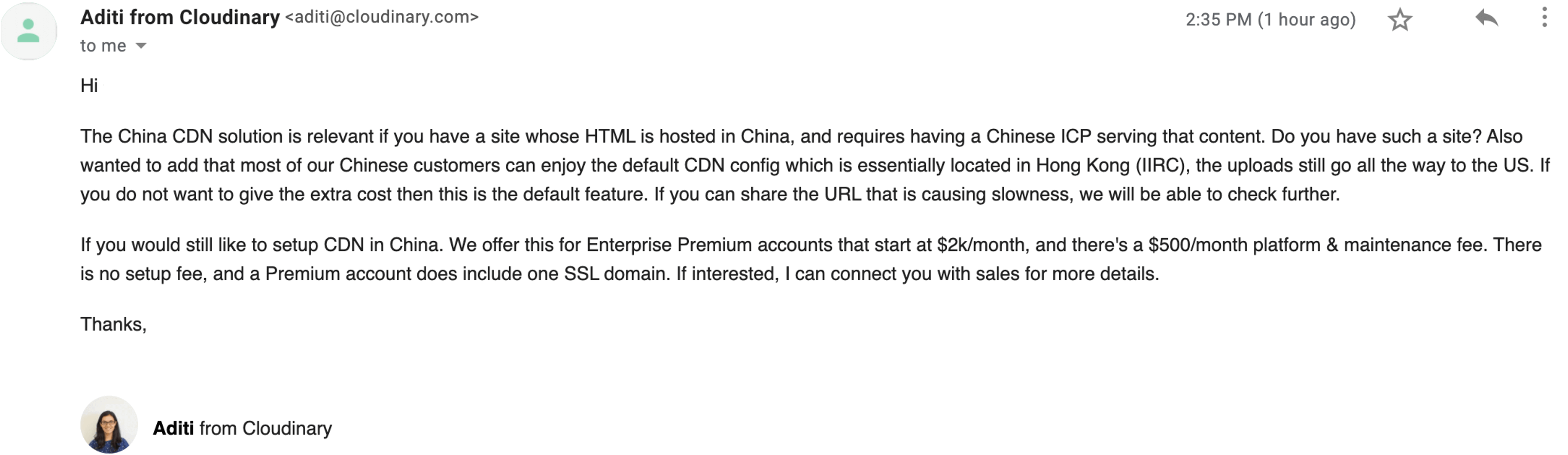 Simply put, Cloudinary’s only solution for China will require a subscription to their Enterprise Premium Package. Their solution to access Chinese CDNs will cost upwards of $30,000 USD per year.