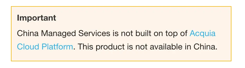 Acquia’s website states that their service does not work in China. Acquia relies on services like AWS to host their Drupal-powered platform. These western hosting providers do not work well in China, as we’ll see below.