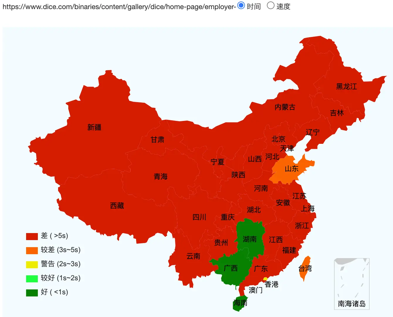 From our speed test, people in China will have difficulty viewing the images and opening Dice.com (that’s what the below figure means, red means unable to display images).