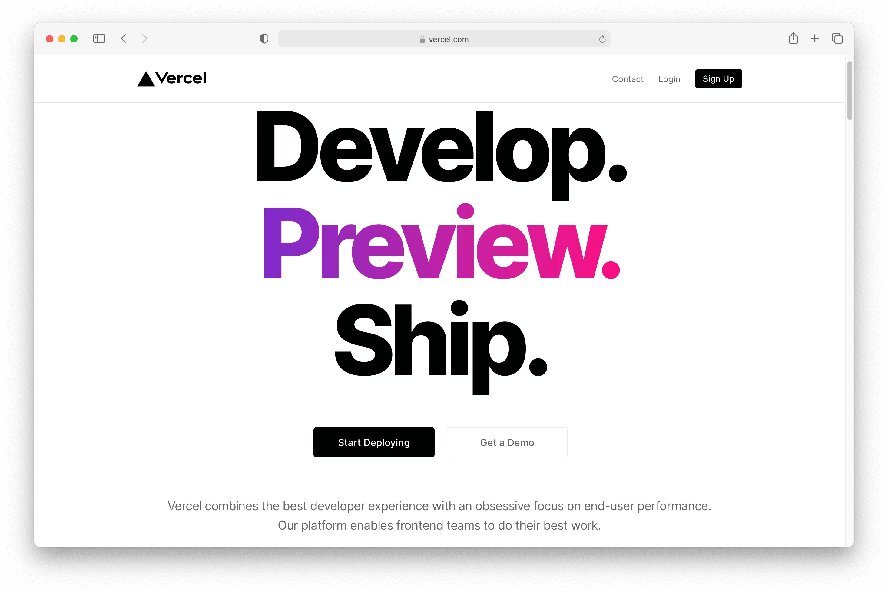 Vercel is a deployment and hosting platform for frontend frameworks and static sites, built to integrate with headless content, commerce, or database.