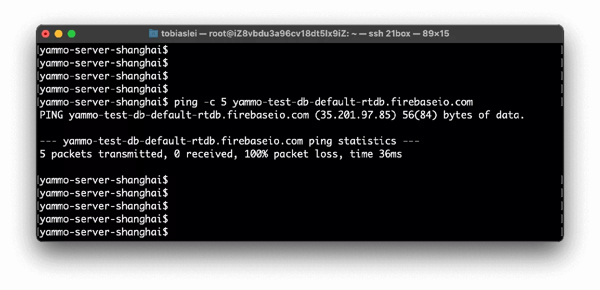 This time the ping test show’s “100% packet loss”. Meaning that Firebase Realtime database is NOT accessible in mainland China.