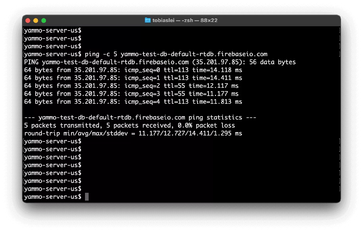 As expected, “0% packet loss”, Firebase works in the U.S.
