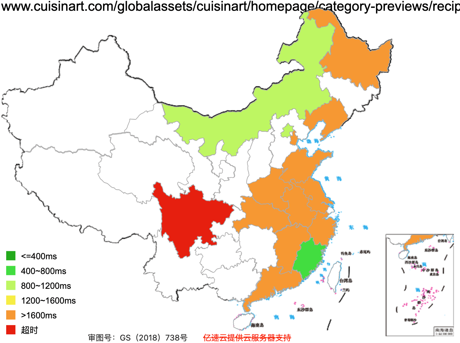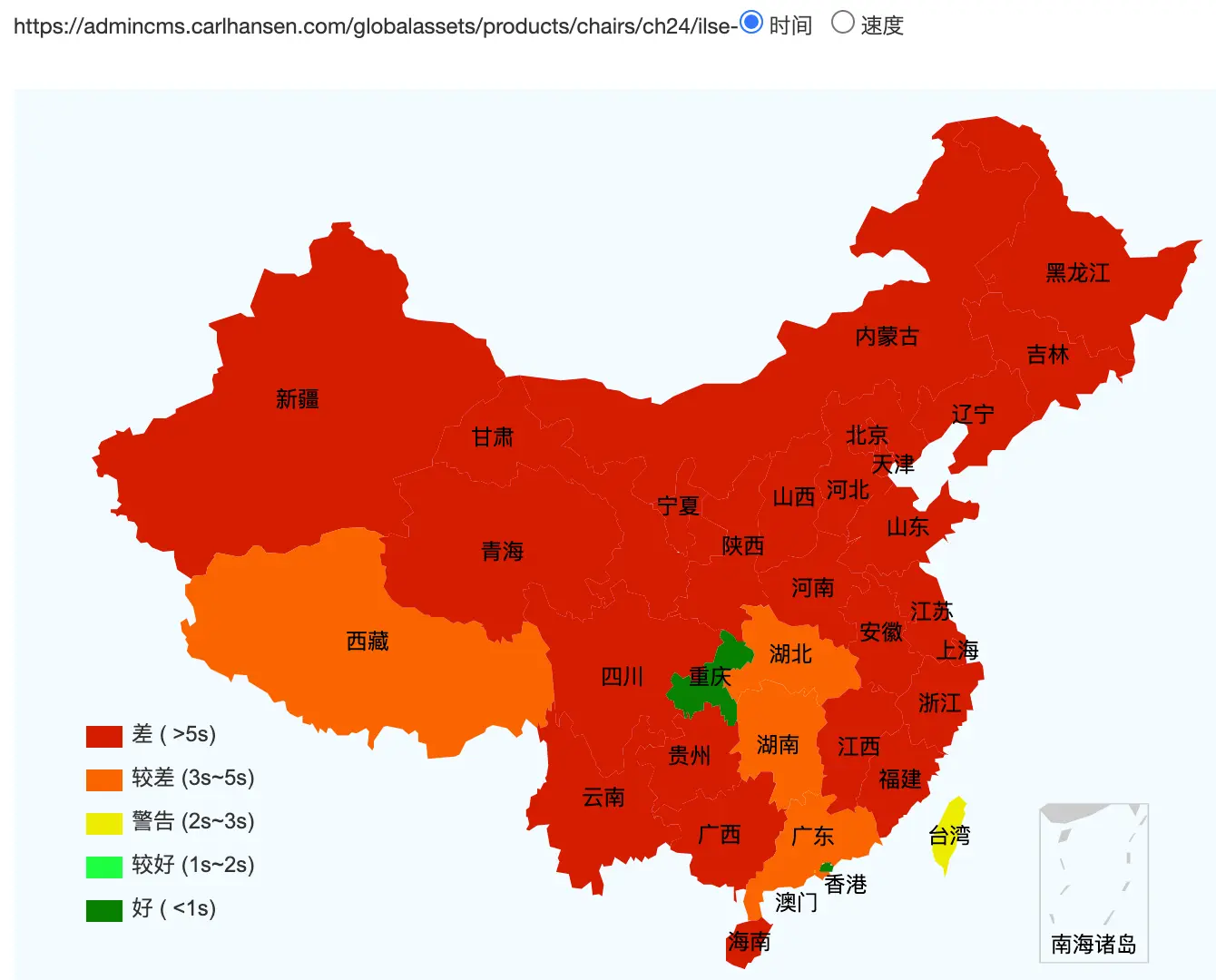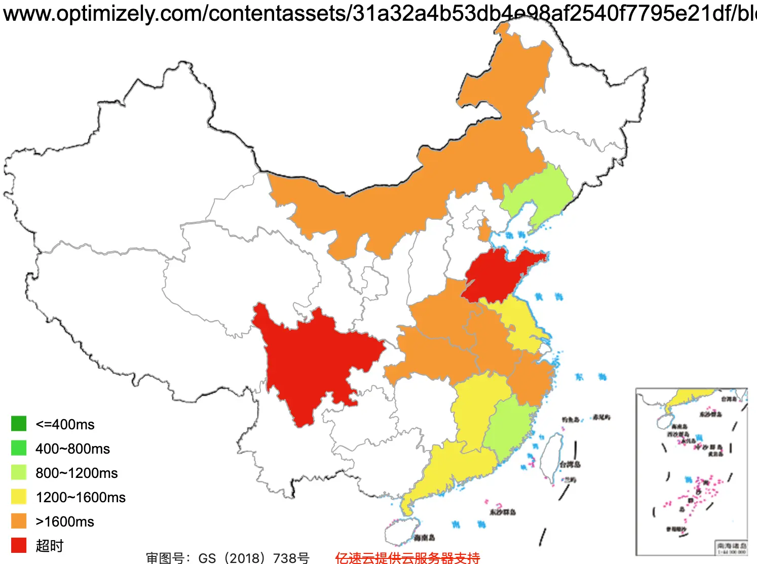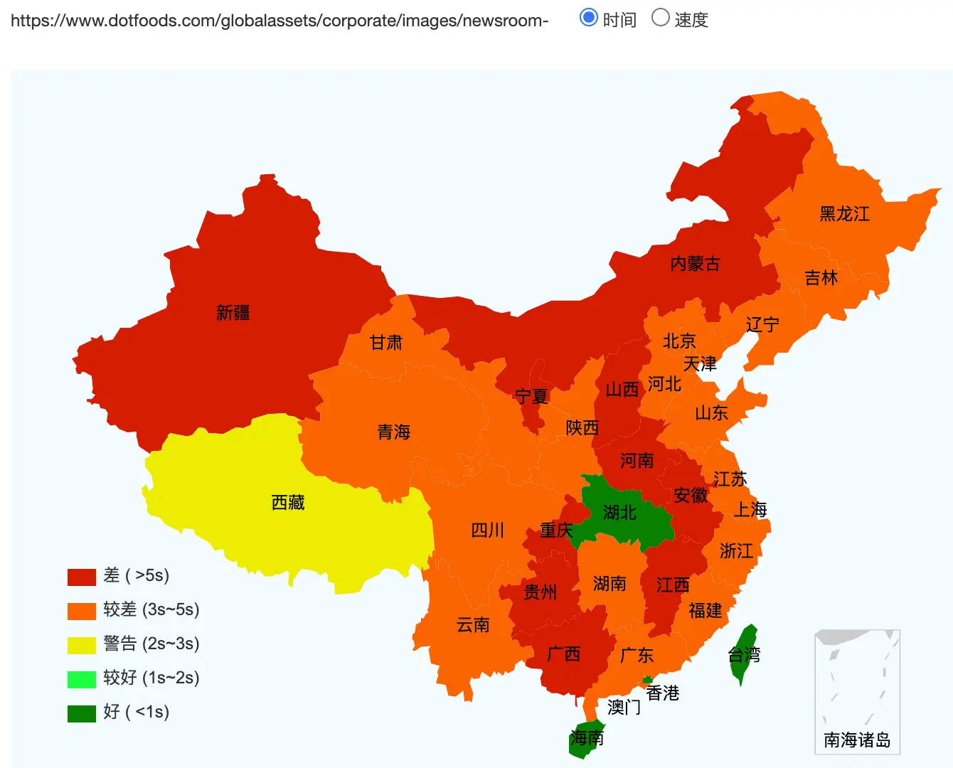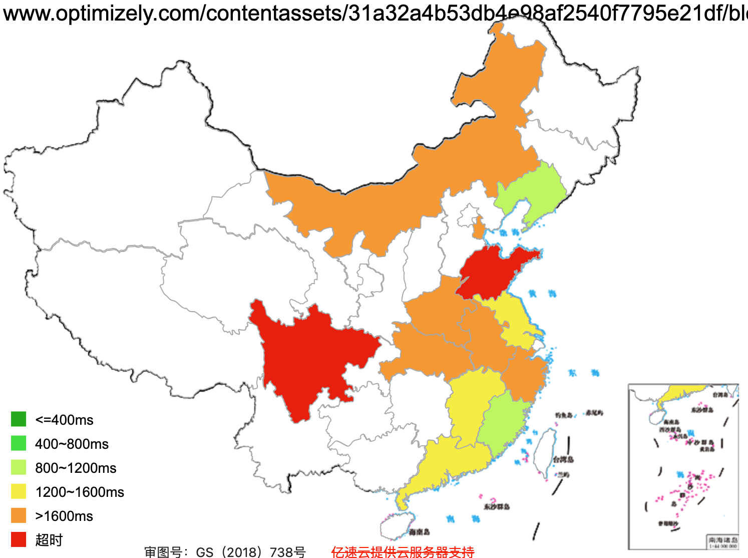 This figure basically shows how fast the website loads across Mainland China (green = fast, red =slow)