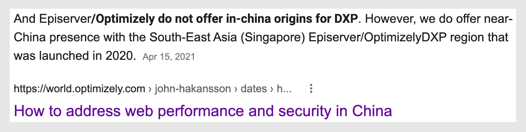 TLDR; Optimizely (aka Episerver) does not work in China. Websites built with Optimizely’s Digital Experience Platform load in 40+ seconds and have broken images and videos. Many Optimizely DXP sites are not even accessible in China. This article explains why Optimizely has poor performance in China and then provides you with the only solution to fix your existing Optimizely site that is fully compliant with the laws in mainland China.