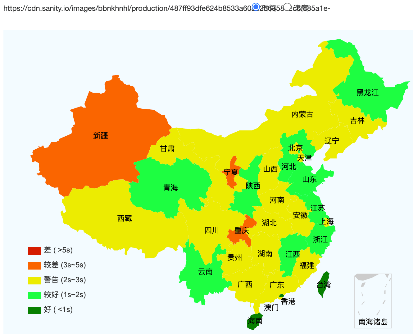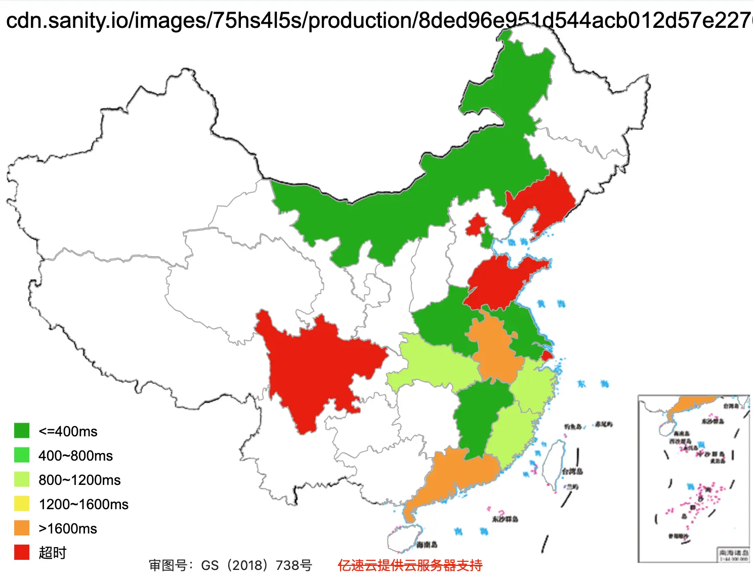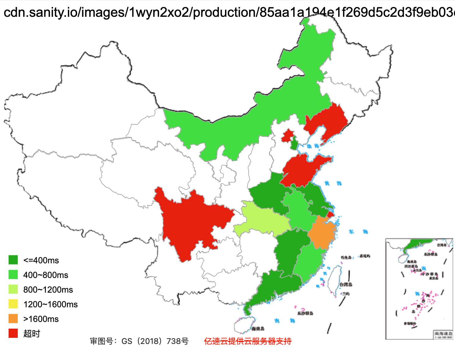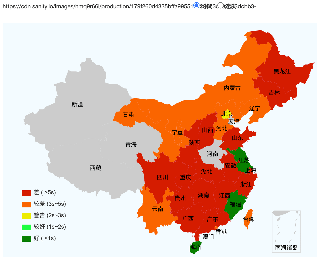 This figure basically shows how fast the website loads across Mainland China (green = fast 👍, red/orange/yellow/grey = slow 👎)