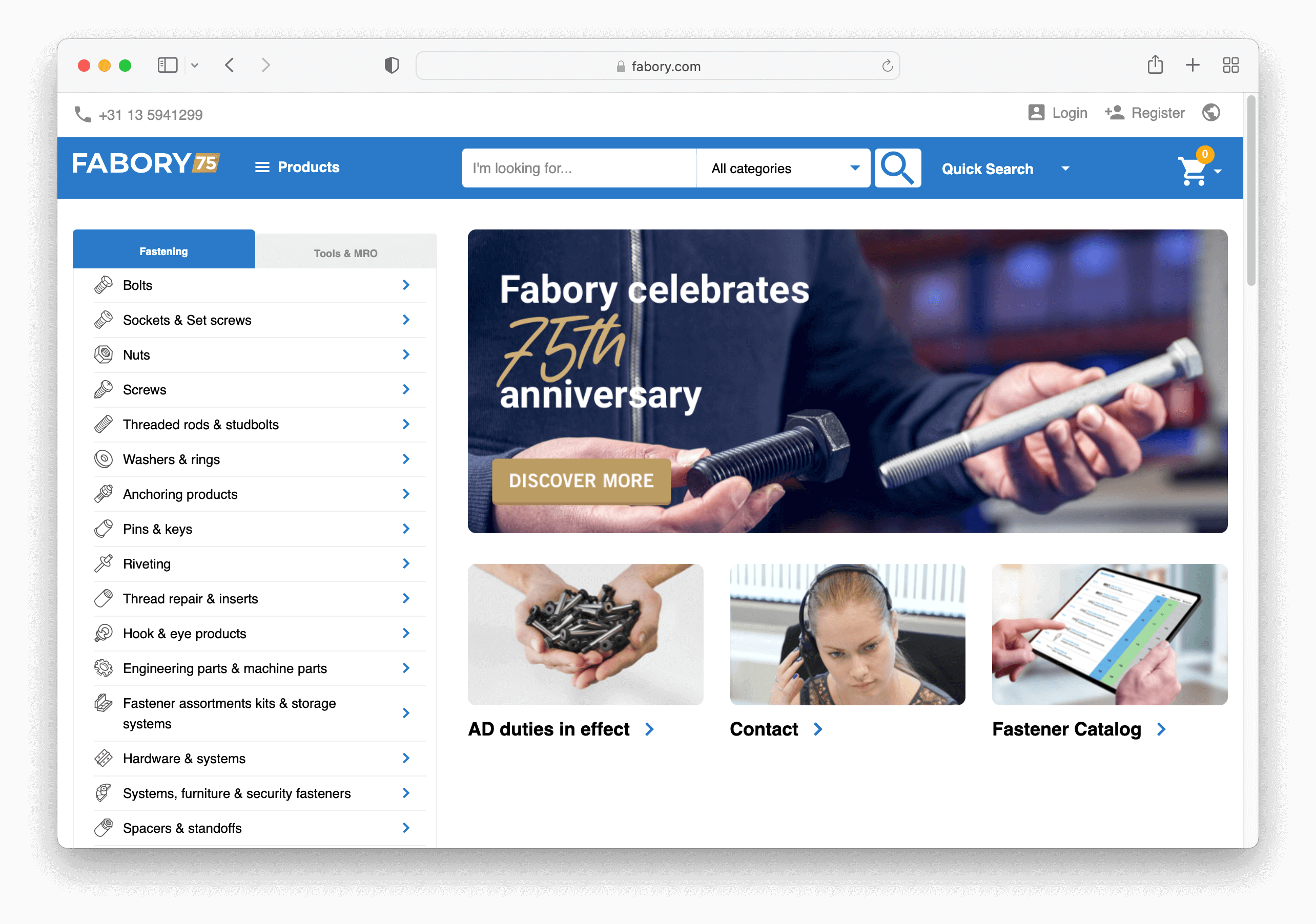 Fabory manufactures and supplies bolts, nuts, washers, hexagon socket products, screws, and supplies hand, cutting, and electrical tools, world-wide.