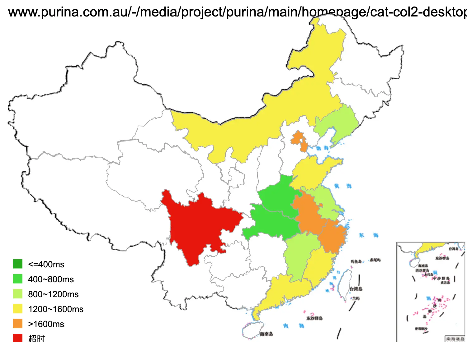 From our speed test, people in China will have difficulty opening on the Purina website (that’s what the below figure means, red means unable to display images).