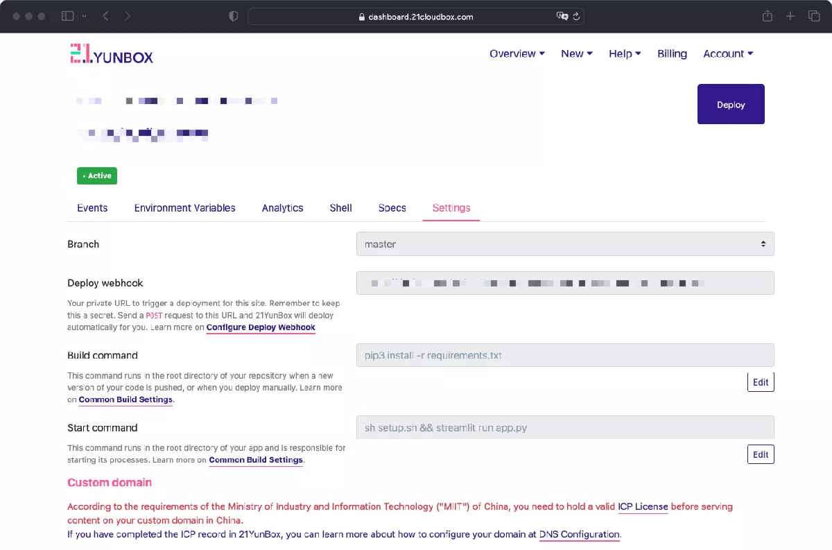 It takes a couple of minutes, the 21YB build bot will build and run your app for you in China, and you will be assigned a custom domain to access your web app.