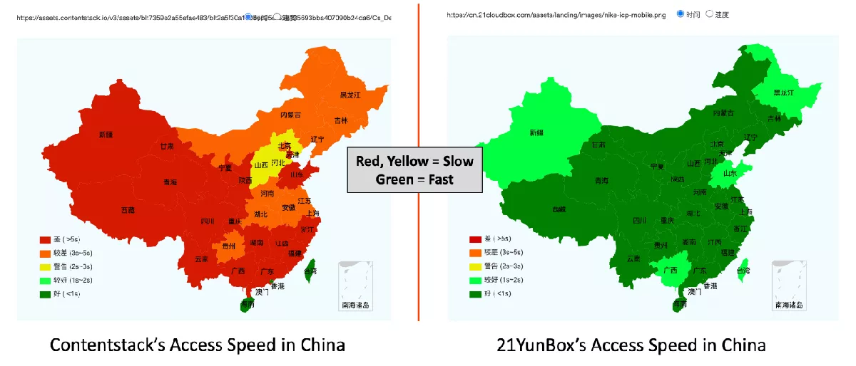 As you can see, the speedtest shows that the Contentstack delivered asset is extremely slow in China, mostly red,orange, and yellow.