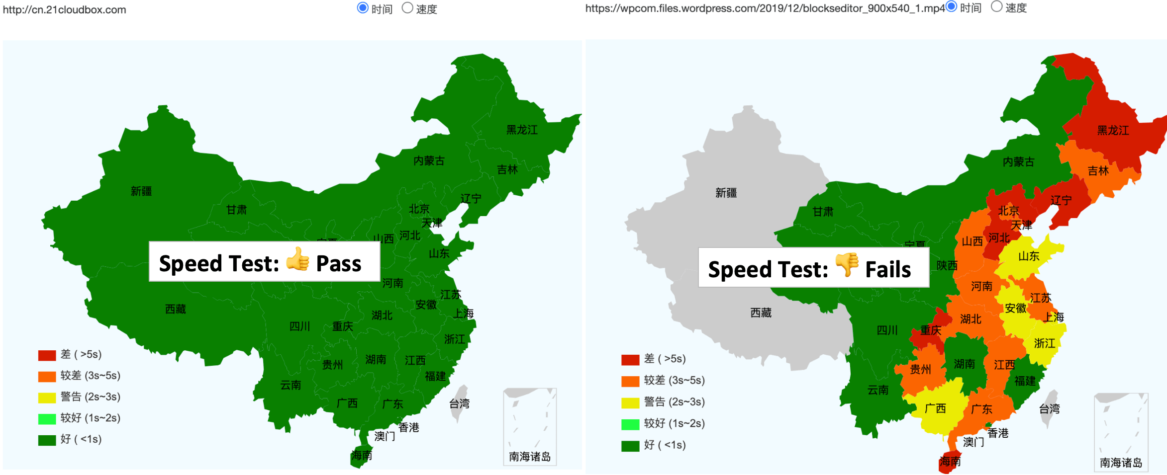 The test on the left is considered a Pass, whereas the right is considered a failure because it is either slow or inaccessible across much of China.