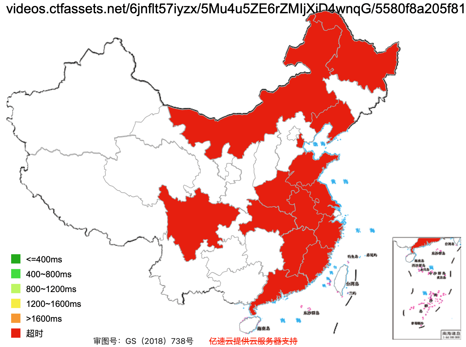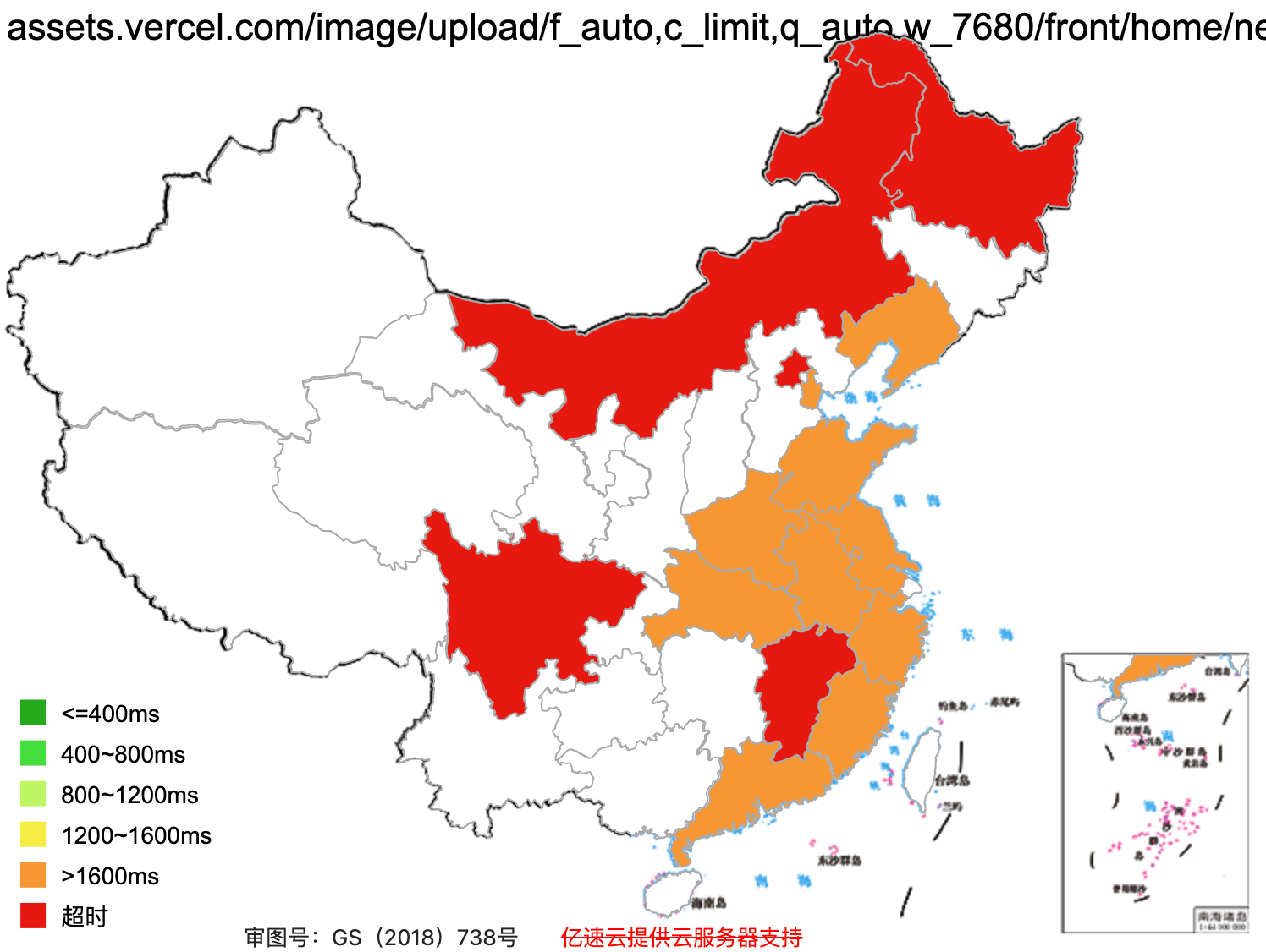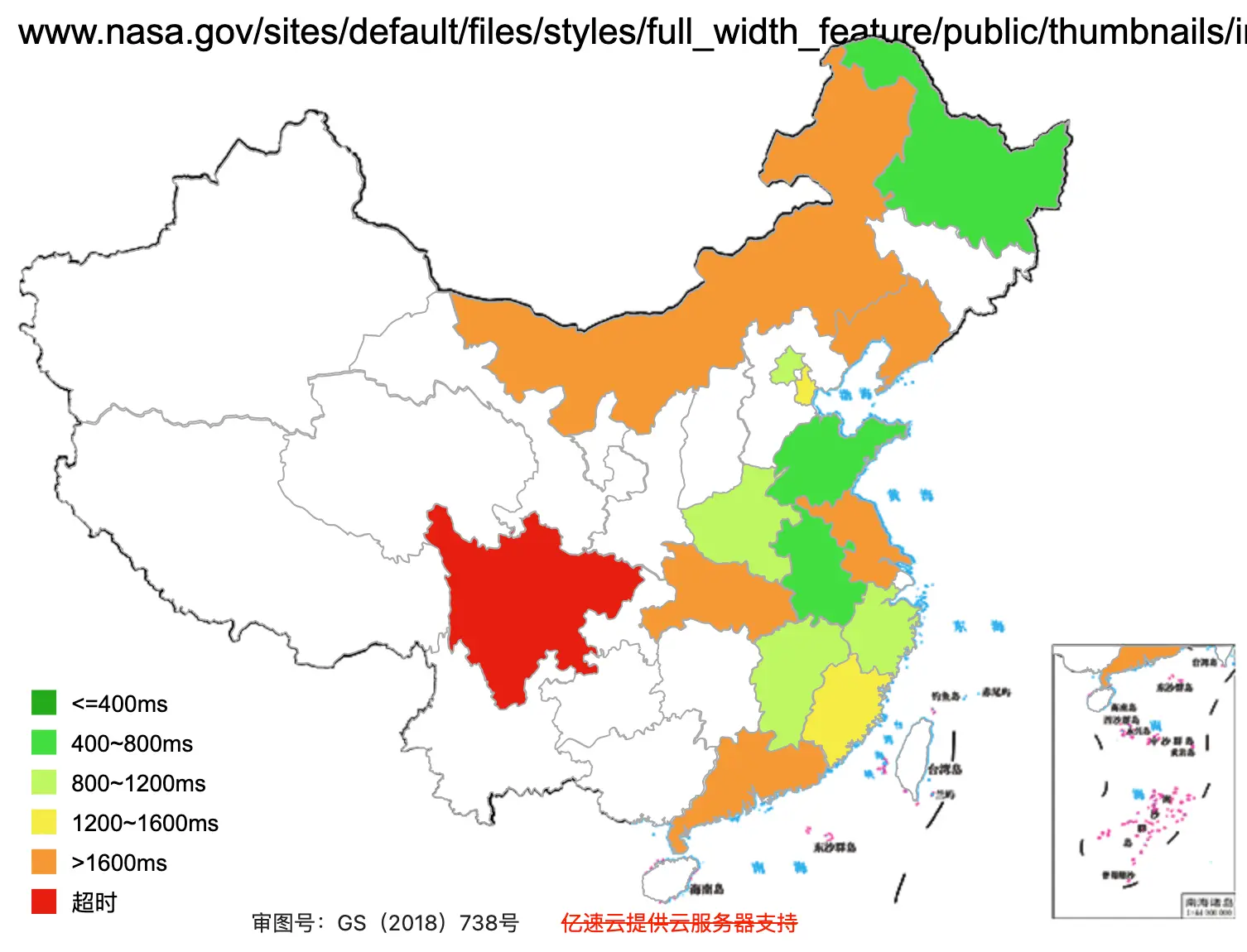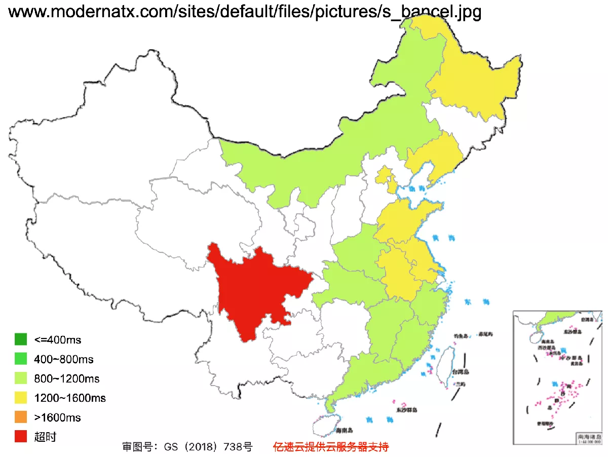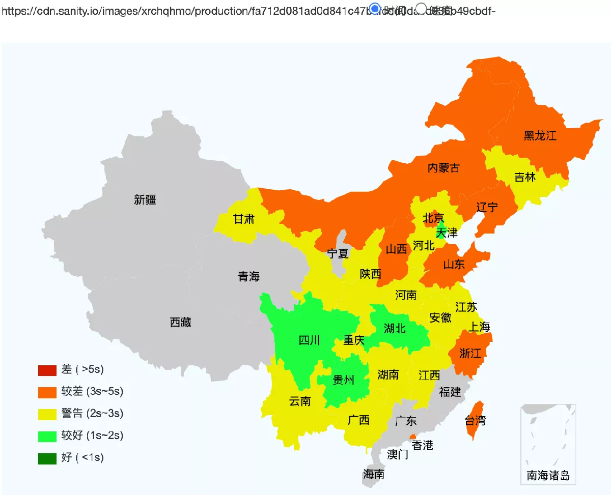 This figure shows how fast the website loads across Mainland China (green = fast, red = slow. grey/white = inaccessible).