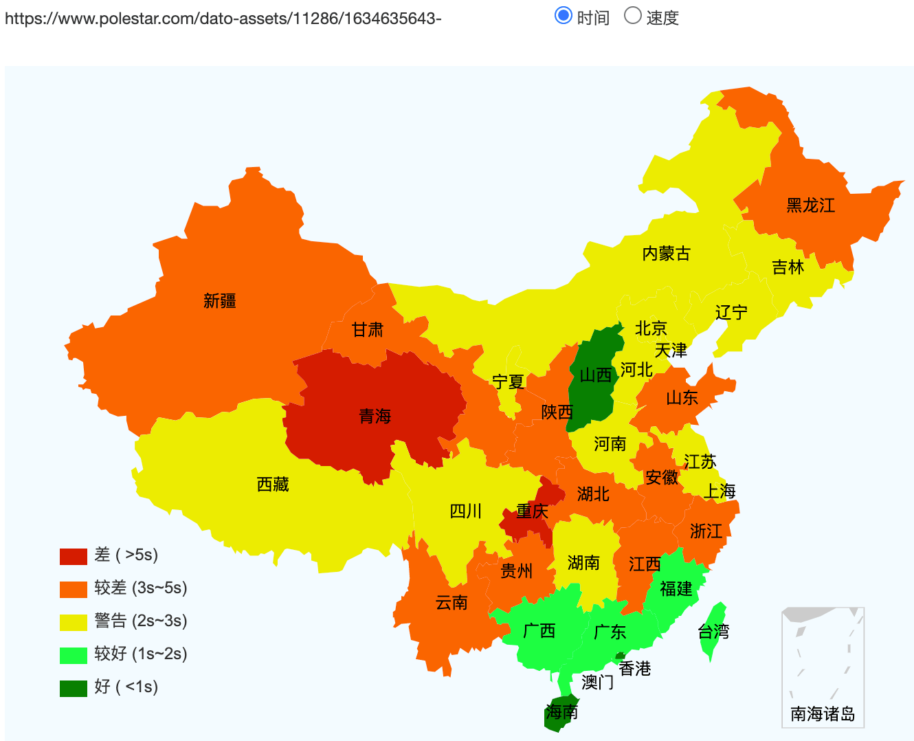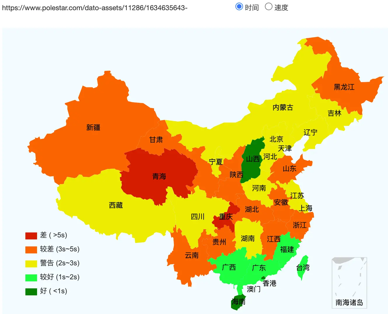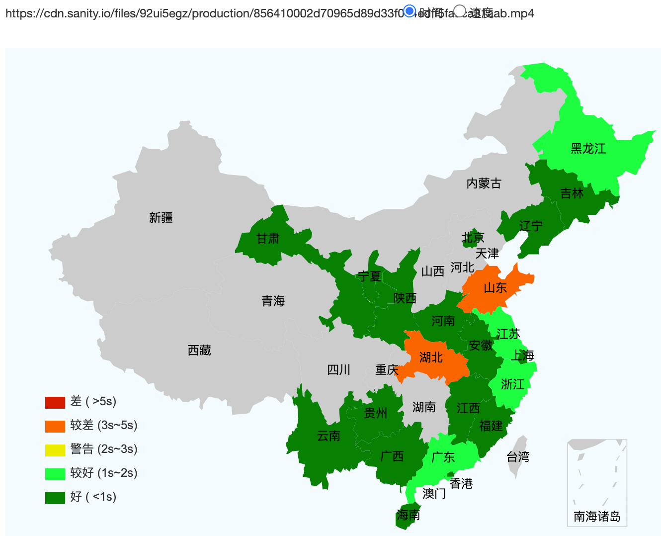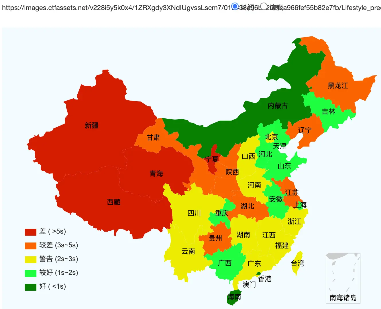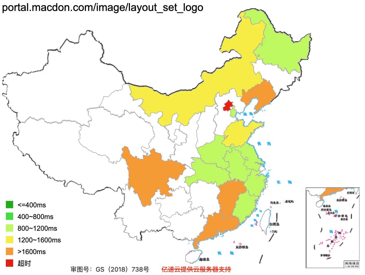 This figure shows how fast the website loads across Mainland China (green = fast, red = slow. grey/white = inaccessible).