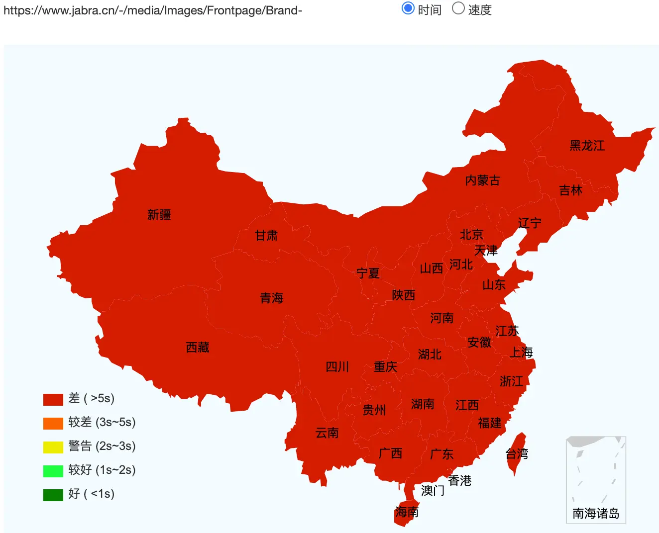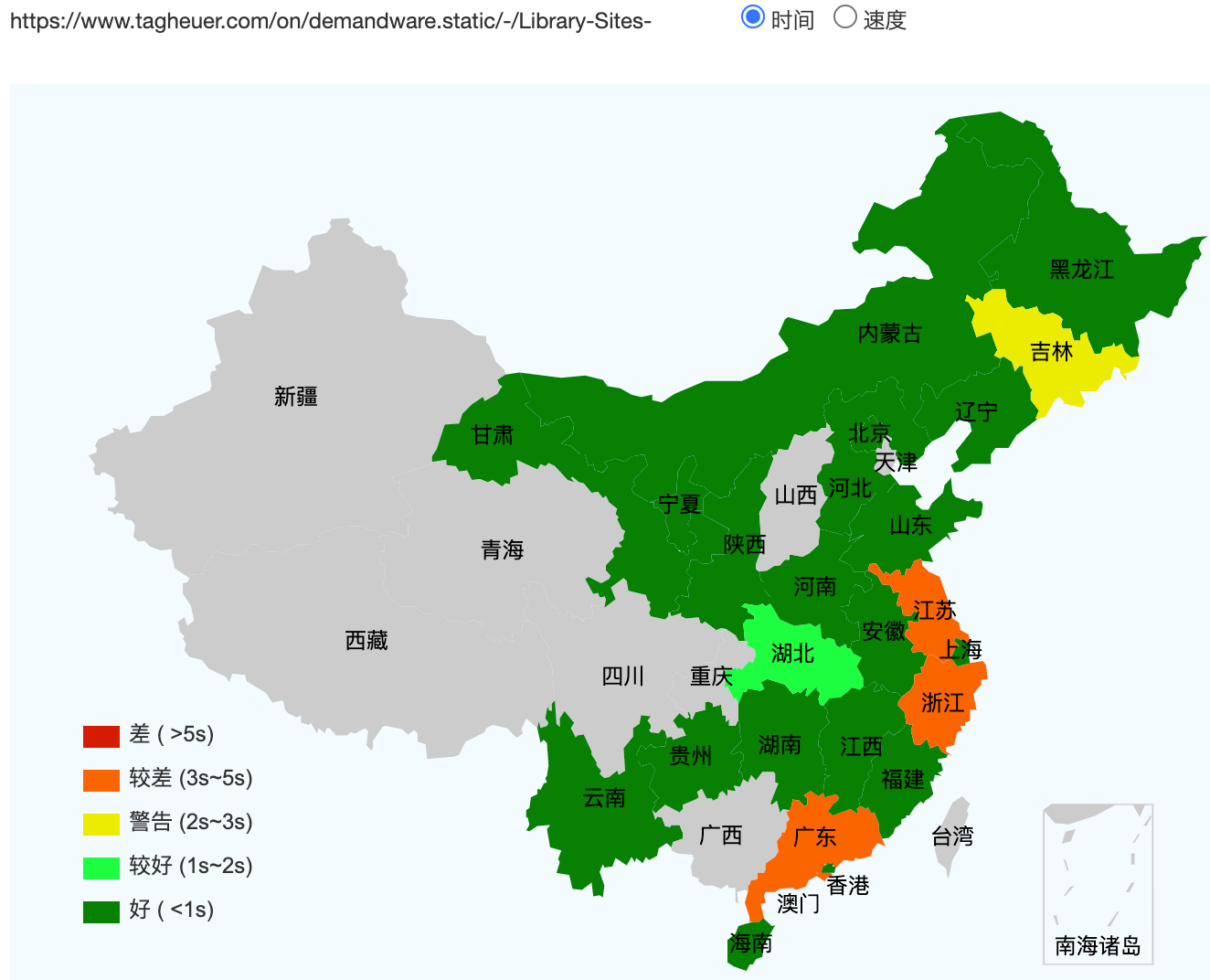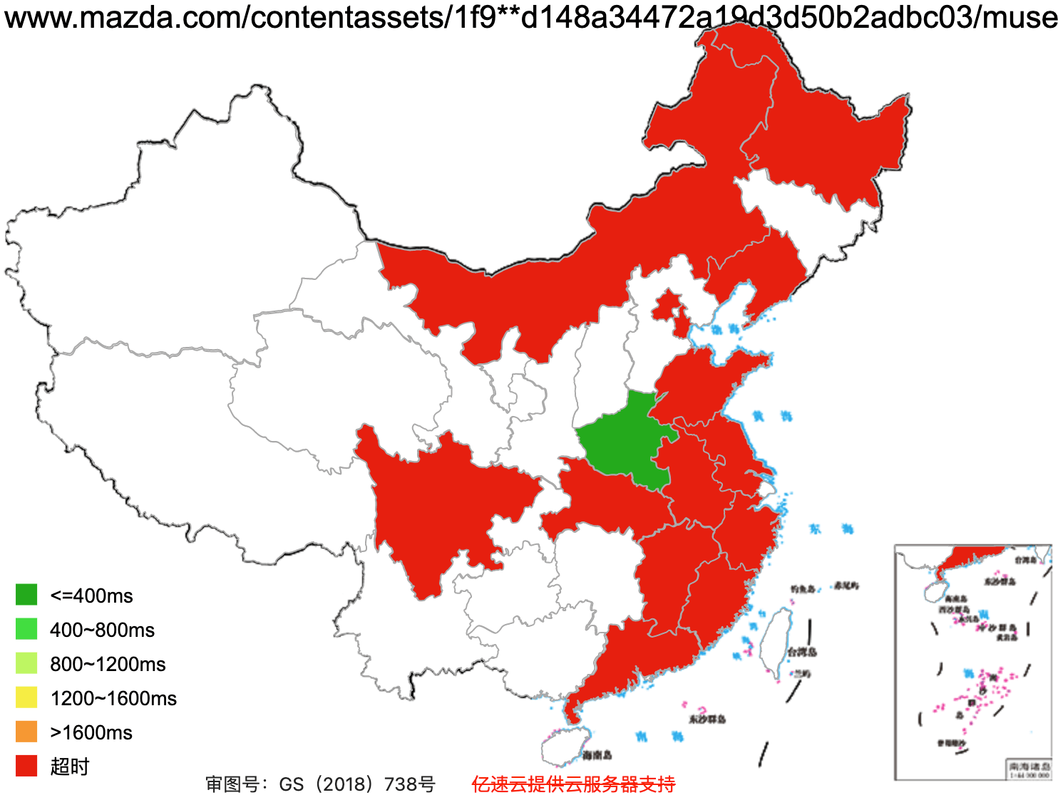www.manutd.com access speed across mainland China (green: fast, red: slow)