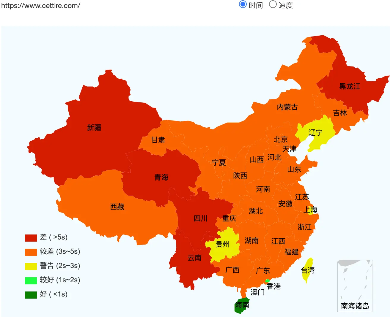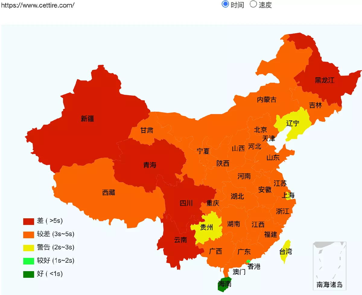 cettire.com access speed across mainland China (green: fast, red/orange: slow)